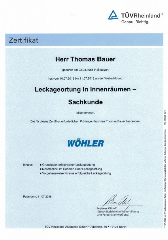 Wir sind seit Juli 2018 ein zertifizierter Betrieb der Leckageortung in Innenräumen. Dank unserer jahrzente langen Erfahrung im Sanitärhandwerk, sind wir in der Lage, den fachlich saubersten und die ökonomisch sinnvollste Lösung der Reparatur für unsere Kunden anzubieten. Die Leckageortung führen wir mit modernsten endoskoopie Techniken durch. So ist eine minimal invasive Überprüfung möglich, ohne größere Schäden zu hinterlassen.